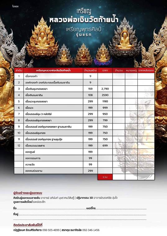 รายการ 9.เนื้อบรอนซ์ องค์ชุบทองลงยา ฐานรมซาติน ราคาจอง 750.-บาท มียอด = 5