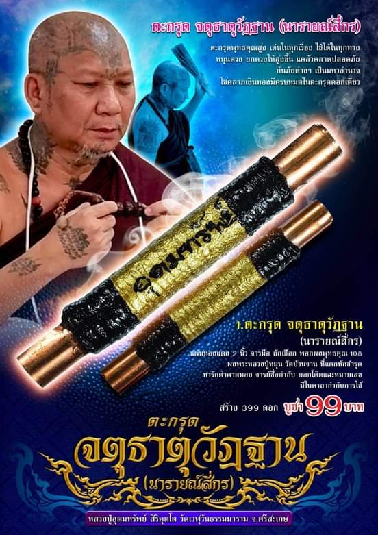 1.ตะกรุด จตุธาตุวัฎฐาน(นารายณ์สี่กร) ตะกรุดพุทธคุณสูง เด่นในทุกเรื่อง ใช้ได้ในทุกทาง หนุนดวง ยกดวงให้สูงขึ้น แคล้วคลาดปลอดภัย กันภัยต่างๆ เป็นมหาอำนาจ โชคลาภเงินทองมีครบหมดในตะกรุดดอกเดียว สร้าง 399ดอก 99บาท