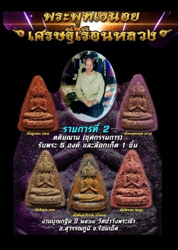 (พระพุทโธน้อย 5 องค์ เนื้อผงพุทธคุณ (ม่วง) / เนื้อปูนแดง (แดง) /เนื้อใบลาน (เทา) / เนื้อไพรเสก (ชมพู) / เนื้อดินเผา (น้ำตาล) ฝังตะกรุดเงิน อุดมวลสารคุณแม่บุญเรือน / ล้อกเก็ตคุณแม่บุญเรือน 1 อัน)
