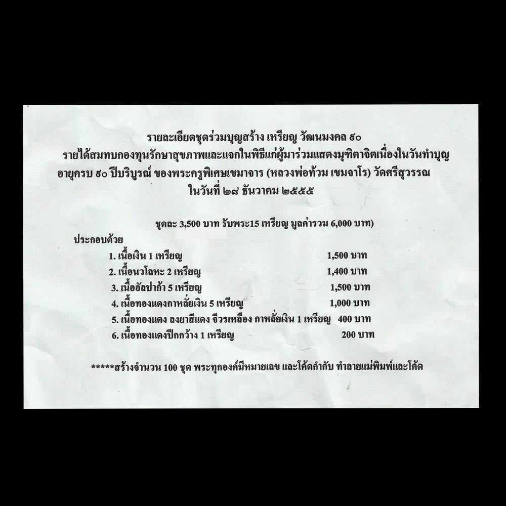หัวข้อกระทู้ : รายละเอียดชุดร่วมบุญสร้าง เหรียญ วัฒนมงคล 90 รายได้สมทบกอง ทุนรักษาสุขภาพและแจกในพิธีแก่ผู้มาร่วมแสด