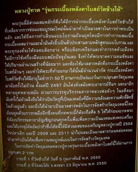 ด้วยมวลสารอันสุดยอดหาที่ไหนไม่ได้อีกแล้วก็คือเนื้อกระเบื้องหลังคาโบสถ์วัดช้างไห้ล้วนๆ ทีมีอายุไม่ต่ำกว่า50ปี ผ่านร่มเงาการปลุกเสกวัตถุมงคลของวัดช้างไห้อันลือลั่นนับนับครั้งไม่ถ้วน พระรุ่นนีได้ผ่านพิธีกรรมการปลุกเสกที่วัดช้างไห้และวัดพระโคะ(ทั้งสองวัดที่เป็นวัดแห่งปฐมบทและวัดที่เป็นตำนานอมตะแห่งองค์หลวงปู่ทวดเหยียบน้ำทะเลจืดอันสักสิทธิ์) พระทุกองค์ยิงเลเซอร์หมายเลขกำกับ ชัดเจนแน่นอน แบบพิมพ์ทำแบบย้อนยุคในสมัย2497อันลือลั่น พระทุกองค์กดด้วยมือทั้งหมด และจำนวนการจัดสร้างถือว่าน้อยมากครับเพราะพระทุกพิมพ์รวมกันไม่เกิน 12000 องค์เท่านั้น เนื่องจากมวลสารมีจำกัด