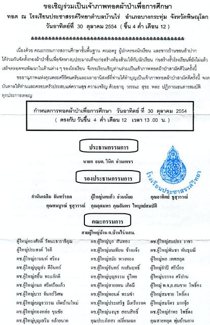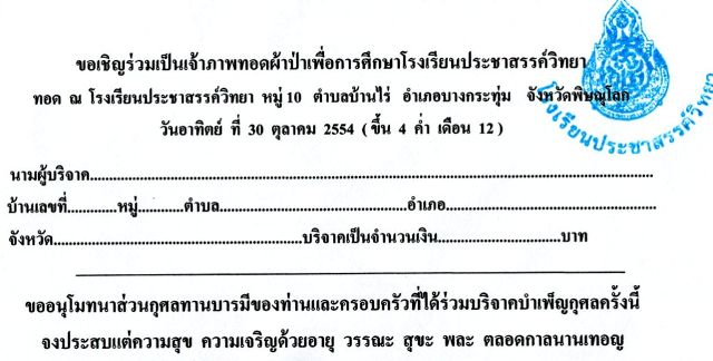 เนื่อจากทางโรงเรียน ประชาสรรค์วิทยา จ.พิษณุโลก ยังขาดแคลนงบประมาณในการ ซ่อมแซมและจัดสร้าง ห้องน้ำห้องส้วม และรั้วโรงเรียน ทางคณะกรรมการสถานศึกษาขั้นพื้นฐาน และคณะครู ชาวบ้าน จึงได้จัดตั้งกองผ้าป่าเพื่อการศึกษาขึ้น และเนื่องด้วยภรรยาของข้าพเจ้า นั้นเป็นศิษย์เก่าของโรงเรียน ข้าพเจ้าจึงรับอาสาหาทุนบางส่วนช่วยเหลือโรงเรียน โดยวิธีการของข้าพเจ้า