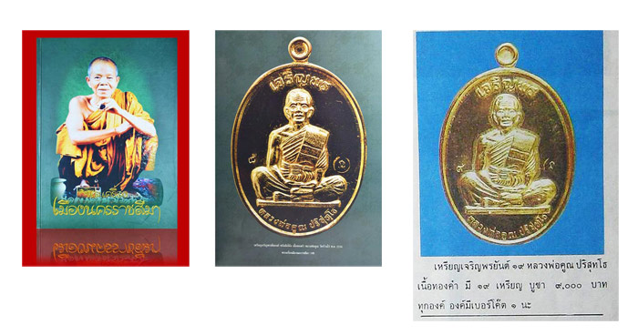 เหรียญเจริญพรบนเต็มองค์หนังสือโค้งประคตมน เนื้อทองคำ ตอกโค็ด นะ และหมายเลข ๘ และเลข ๙ ส่วนใหญ่จะเห็นอยู่ในหนังสือรวมเล่มหลวงพ่อคูณและจะเห็นแต่รูปด้านหน้าเหรียญจะไม่เห็นรูปด้านหลังเหรียญตัวอย่าง2เหรียญนีี้ก็เป็นหนังสือโค้งประคตมนยังไม่พบเห็นหนังสือตรงเลยทั้งที่จำนวนจัดสร้างเนื้อทองคำมี19เหรียญอาจจะถูกหลอมคืนไปบ้างส่วนก็ทำให้เหลือน้อยลงมาก ผมได้เห็นเหรียญจริงมาแล้วเป็นเนื้อทองคำหนังสือโค้ง ตอกโค็ต(นะ)ตอกโค็ดหมายเลข(๑) ซึ่งตอนนี้ได้อยู่ในร้านของอ.มหาเวส และเป็นเหรียญที่ได้รางวัลที่1ในงานประกวดพระเครื่องที่โคราชที่ผ่านมาด้วยครับ |