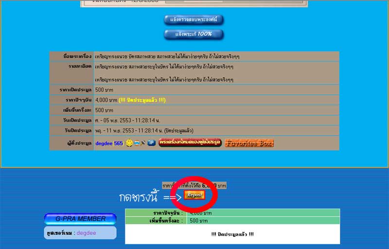 REPOST คือเครื่องมือที่ช่วยให้ผู้ตั้งประมูลทำการตั้งประมูลรายการที่ปิดประมูลไปแล้วแต่ยังไม่ถึงราคาขั้นต่ำที่เราตั้งไว้ครับ