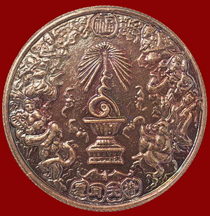 ขอบนอกสุดของเหรียญเป็นรูปโป้ยเซียน หรือ 8 เซียน ซึ่งเป็นสุดยอดแห่งเซียนของจีนที่ถือกันว่ายิ่งใหญ่ที่สุด ถัดมาเป็นรูปค้างคาว 5 ตัว หมายถึง ฮก ลก ซิ่ว กิก ฮี่ (บุญ ลาภยศ อายุยืน สิริมงคล ผาสุข) ด้านล่างสุดของเหรียญมีภาษาจีน 4 ตัว อ่านว่า โพว เทียน ตัง เข่ง อันมีความหมายว่า ทั่วฟ้าดินร่วมกันเฉลิมฉลอง