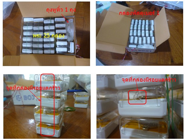 เมื่อวานได้รับพัสดุที่จองพระไว้ ส่งมาถึงบ้านตรวจเช็คภายนอกกล่อง โอเค ไม่มีรอยยับ ไม่มีรอยฉีกขาดตรวจเช็คชื่ออ้าวไม่มีชื่อเราแต่ดันเป็นชื่อ ยูเซอร์เนมในเวป G แฟนก็ถามอยู่ว่าชื่อใคร ยังดีที่ที่อยู่ถูกต้อง ก่อนเปิดกล่องก็เฉลียวใจว่าทำไมกล่องเล็กจัง พระ 25 กล่อง แพ๊คใส่กล่องพัสดุเบอร์ 1 มา ก็คิดในใจว่ากล่องพระคงจะเล็กมั้งเริ่มใจแป้วนิดนึง บรรจงเปิดกล่องออกมาดู โอ้ แทบไม่เชื่อสายตาตัวเอง จากที่ยืนลุ้นอยู่เข่าอ่อนเลยครับ ไม่มีอะไรห่อหุ้มเลย มีถุงหูหิ้วอันนึงยัดด้านข้างมา ไม่มีอารมย์จะเช็คพระเลยตอนนั้น ทำใจสักพักก็มานั่งตรวจดู พระครบตามจำนวน แต่กล่องมีรอยแตกร้าว ประมาณ 5-6 กล่อง ยังดีพระไม่ได้รับความเสียหาย เลยอยากถามพี่ๆว่าเคยเจอแบบนี้บ้างป่าวครับ ศูนย์จองเขาส่งกันแบบนี้ด้วยเหรอ งง มาก