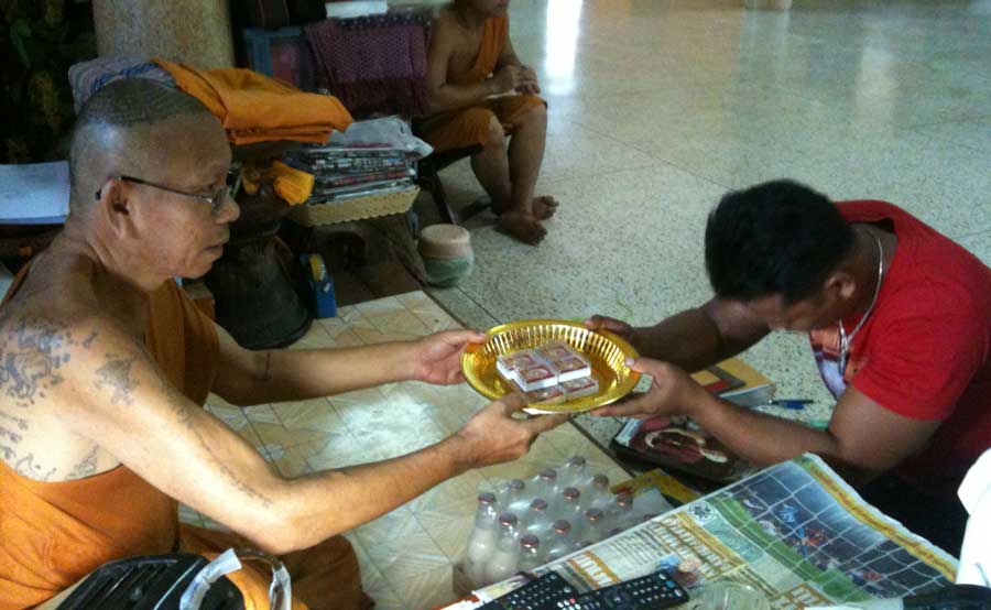 เมื่อวันเสาร์ที่ผ่านมาไปพักผ่อนที่บางแสน เลยถือโอกาสแวะไปกราบพ่อครูบาผาสุกที่บ้านบึง เพราะได้บอกพี่ๆที่มาขอรับไม่ทันว่าถ้ามีโอกาสไปกราบท่านอีกจะหาของมาฝาก พ่อครูบาท่านเลยเมตตาให้ เหรียญรุ่นแรก ท่านมาอีกให้ครบจำนวนคนที่ติดค้างไว้ ครั้งนี้ได้มีโอกาสสนทนากับท่านแบบเป็นกันเองมากๆอีกครั้ง และไม่ลืมถามถึงที่มาของยันต์ด้านหลัง และ ความหมายของคีตที่ตอกลงในเหรียญท่าน