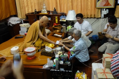 ** เมื่อไปถึงที่วัดศรีอภัยวันเวลาประมาณ 15:45 น. โดยครูบาหมี (รองเจ้าอาวาส) ท่านบอกให้นำรถไปที่ด้านหลังของศาลาเพราะมีลิฟท์ เพื่อให้ขนของได้สะดวก ท่านให้นำของทั้งหมดรวมถึงเครื่องไทยทานเข้ามาในห้องกุฎิหลวงปู่ เมื่อจัดของเรียบร้อยแล้วก็ได้กราบเรียนรายละเอียดต่างๆให้หลวงปู่ทราบว่าตามที่ป๊ากับแม่ได้มาขออนุญาตหลวงปู่ทำผ้าป่าและได้ขอทำเหรียญกับรูปหล่อนั้น บัดนี้เรียบร้อยครบถ้วนแล้ว จึงได้นำของทั้งหมดขอเมตตาหลวงปู่ด้วย