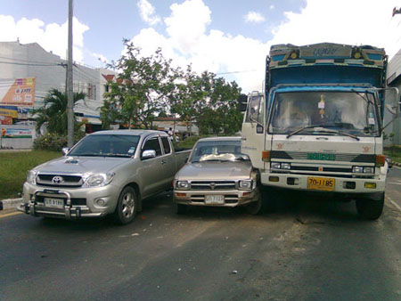 เรื่องมีอยู่ว่า ก่อนเที่ยงวันนี้จะออกไปทำธุระข้างนอกกับครอบครัว มาถึงสามแยกจะเลี้ยวไปจ.อุบล ขณะที่กำลังจอดรอสัญญาณไฟอยู่ ด้านข้างเป็นรถสิบล้อขนมะพร้าวจอดอยู่ ขณะกำลังรอสัญไฟเขียวทันใดนั้นเสียงดังตูม..ก็เกิดขึ้นพร้อมกับแรงสั่นสะเทือนของรถผม..พอหันกลับไปดู..เวรกรรมรถอีกคันมันมาได้งั๊ย สรุปรถผมกับรถสิบล้อโดนชน..หันไปดูลูกกะเมียถามว่าเป็นอะไรมั๊ย ได้รับคำตอบว่าไม่เป็นไร..โล่งใจลงไปดูรถโดนไปข้าง..ดีที่ไม่โดนมากกว่านี้..นึกในใจเดชะบุญที่หลวงปู่คุ้มครอง..ฝากเตือนพี่ๆน้องๆ..แม้เราจอดของเราอยู่ดีๆ..ก็ต้องระวังให้มากๆ (หลายท่านสงสัยห้อยพระอะไร) |