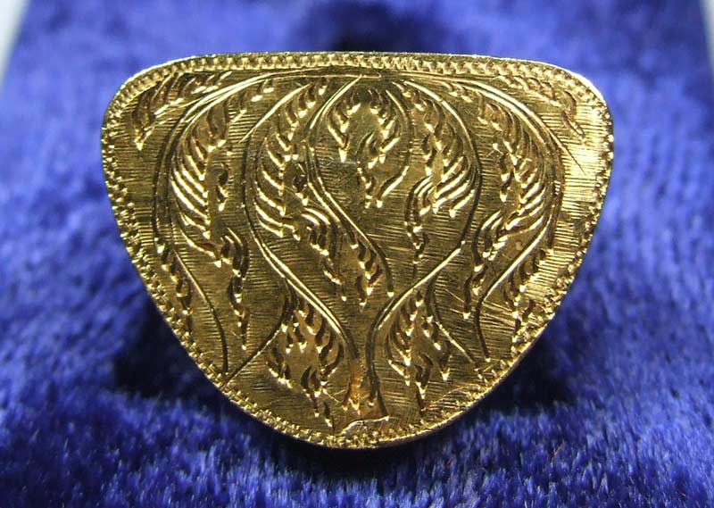 แต่ก้นทองคำของพระเครื่องรุ่นนี้ ใช้ทองคำหนาแกะลายไทย แบบเดียวกับกรอบทองคำครับ การแกะลวดลายแบบนี้ต้องใช้ทองคำหนาครับไม่งั้นจะแกะลายได้ยากเนื่องจากหากใช้ทองบางจะทะลุได้ง่ายเวลาแกะ นอกจากนั้นยังทำการยกขอบขึ้นรอบฐานพระอีกสูงประมาณ 3 มม.ทำให้ใช้ทองคำมากขึ้น