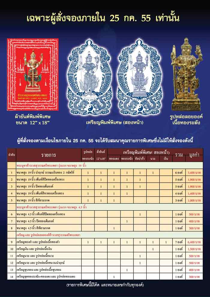 1. คุณบิ๊กได้ปรึกษากับพระอาจารย์อ๊อดเรื่องการให้ "ของแถมพิเศษ" ซึ่งผู้ที่สั่งจองท้าวเวสสุวรรณตรีพระเพลาเนื้อเงิน,นวะ,ชนวนนำฤกษ์ ไม่ว่าจะเป็นรูปหล่อลอยองค์ หรือ เหรียญทรงนั่งพาน จะได้รับ... "รูปหล่อลอยองค์ท้าวเวสสุวรรณตรีพระเพลา เนื้อทองระฆัง" โดยเป็นการแถมแบบ 1 ต่อ 1 เพิ่มเติมจากรายการแถมที่จองเป็นชุดตามโบรชัวร์ครับ เช่น จองลอยองค์เนื้อนวะคู่กับเหรียญนั่งพานเนื้อนวะ จะได้รับ เหรียญฉลุท้าวเวสสุวรรณตรีพระเพลา พิมพ์ 2 หน้า (ตามโบรชัวร์) และจะได้รับลอยองค์เนื้อทองระฆัง "2 องค์" รวมรับพระทั้งหมด 5 องค์ครับ สุดคุ้มครับ