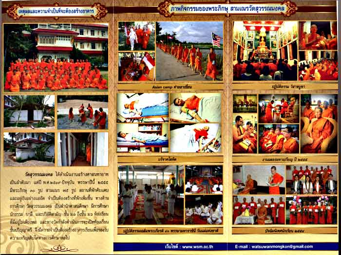 ขอเชิญร่วมงาน วางศิลาฤกษ อาคารพระปริยัติธรรมเฉลิมพระเกียรติ 85 พรรษาหหาราชา และอาคารเมตตารธรรม โดยเจ้าประคุณสมเด็จพระวันรัต และเจ้าประคุณสมเด็จพระพุทธชินวงศ์ และหลวงปู่บัว ถามโก อ่านประวัติโดย ย่อของวัด สุวรรณมงคล ที่พระเจ้าตากได้สร้างไว้และพระพุทธศิลปสมัยอู่ทอง อันเชิญมาจากกรุงธนบุรี อายุหลายร้อยปี พิธีในวันที่22ธันวาคม 2555 ในงานมีเหรียญหยดน้ำกะไห่ลทองปลุกเศกเดี่ยว โดยหลวงปู่บัว ถามโก วัดเกาะตะเคียน จ.ตราดเมื่อปี 54 สร้างทั้งหมดจำนวน1000เหรียญเป็นเหรียญบล็อคแตกทั้งหมด ให้บูชา ในวันงานด้วยนะครับ สวยมากครับ |