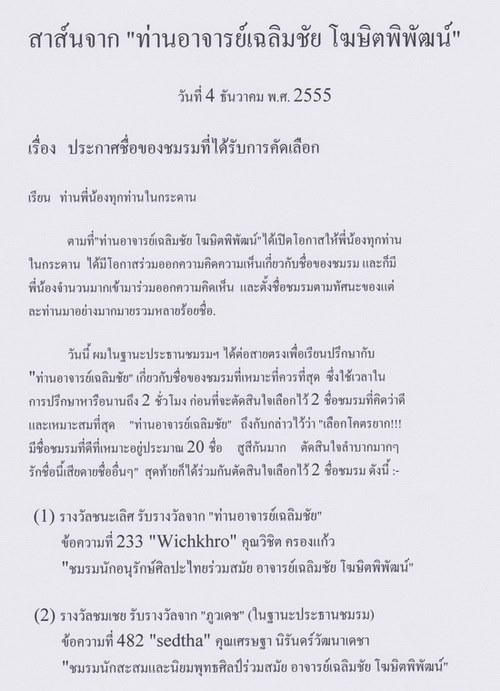 เรื่อง...ประกาศผลการคัดเลือกชื่อชมรมฯ พุทธศิลป์ อ.เฉลิมชัย ใหม่อย่างเป็นทางการครับ