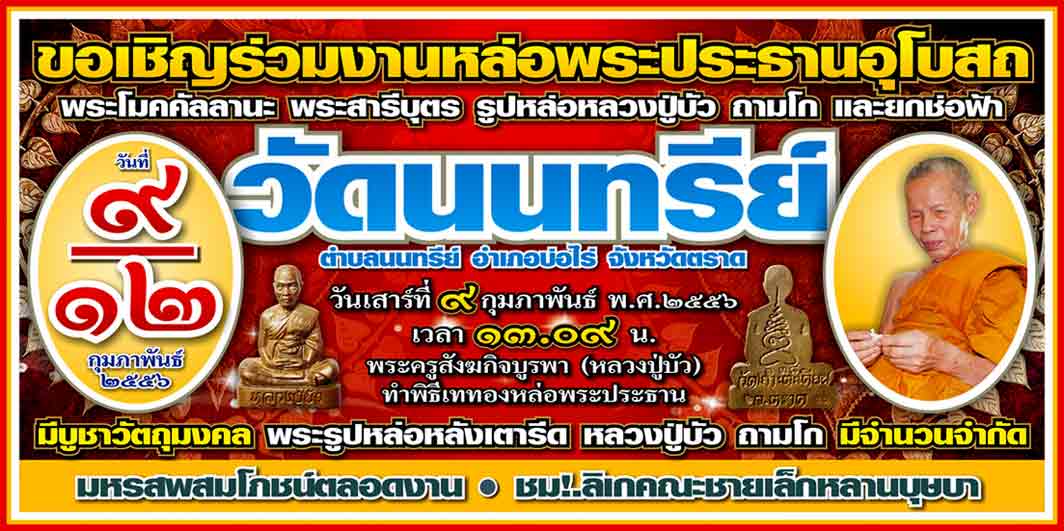 ขอเรียนเชิญร่วมงานหล่อพระประธานอุโบสถ วัดนนทรีย์ ต.นนทรีย์ อ.บ่อไร่ จ.ตราด