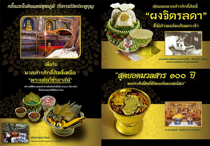 ซึ่งเป็น มวลสารทองคำศักดิ์สิทธิ์ ที่ปิดองค์ หลวงพ่อโสธร ที่พระพรหม สุธีรักษาการเจ้าอาวาสวัดโสธรฯในครั้งนั้น มอบให้กับโรงพยาบาลภูมิพลอดุลยเดช เนื่องในโอกาสครบรอบ ๖๐ ปี ซึ่งเกิดจากความศรัทธาเลื่อมใสของประชาชนชาวไทยมาแต่ครั้งโบราณกว่า ๑๐๐ ปี โดยในครั้นปี พ.ศ. ๒๕๔๙ ได้มีการบูรณะองค์หลวงพ่อโสธรครั้งยิ่งใหญ่จึงได้มีพิธีการลอกทองคำออกจนถึง เนื้อแท้ขององค์หลวงพ่อโสธร จากนั้นจึงได้มีการปิดทองคำองค์หลวงพ่อโสธรใหม่ ดังที่ปรากฎในปัจจุบันพร้อมทั้งนำผงธูปศักดิ์สิทธิ์และดอกไม้มงคลหน้าแท่น บูชาองค์หลวงพ่อโสธร มาร่วมกับสุดยอดมวลสารศักดิ์สิทธิ์ที่ได้กล่าวไว้ทั้งหมดข้างต้นมาประกอบ พิธีมหาพุทธาภิเษกอันยิ่งใหญ่ใต้ต้นพระศรีมหาโพธิ์เมืองพุทธคยาโดยมีท่านเจ้าคุณพระราชรัตนรังษี เป็นองค์ประธานฝ่ายสงค์ และศาตราจารย์เกียรติคุณนายแพทย์อรุณ เผ่าสวัสดิ์ เป็นประธานฝ่ายฆราวาส พร้อมคณะสงค์นานาชาติร่วมในพิธีด้วย |