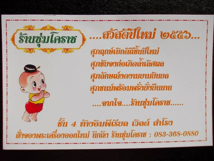 ด้วยน้ำใจและไมตรีจิตของคุณกันต์ธีร์ แห่งร้านซุ่มโคราช ... ห้างอิมพีเรียลเวิลด์ ชั้น 4 สำโรง ผมได้รับปฏิทินตั้งโต๊ะและบัตรอวยพรปีใหม่ ด้วยความขอบคุณยิ่ง ขอให้คุณกันต์ธีร์ หรือที่พวกเราเรียกขานกันว่า "ซุ่มโคราช" แห่งร้านซุ่มโคราช ประสบแต่สิ่งดีดี ได้โชค ได้ลาภอย่างสม่ำเสมอ ให้กิจการเจริญรุ่งเรืองและมั่นคง ขอให้สมหวังในทุกสิ่งที่ปรารถนาตลอดปีใหม่นี้และตลอดไปครับ ขอขอบพระคุณมากๆครับ  |