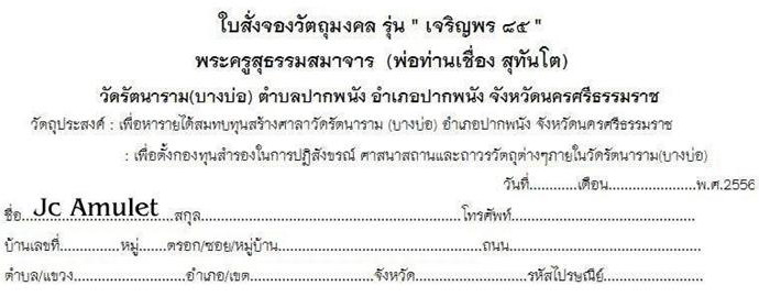 JC Amulet เปิดให้ร่วมจองทำบุญกันคืนนี้ครับ เวลาประมาณ 21:00 น. บวกลบนิดหน่อยแล้วแต่โอกาสครับ คืนวันศุกร์คนเข้าเว็บน้อย เป็นโอกาสดีครับ เลือกจองได้ตามสบายครับ