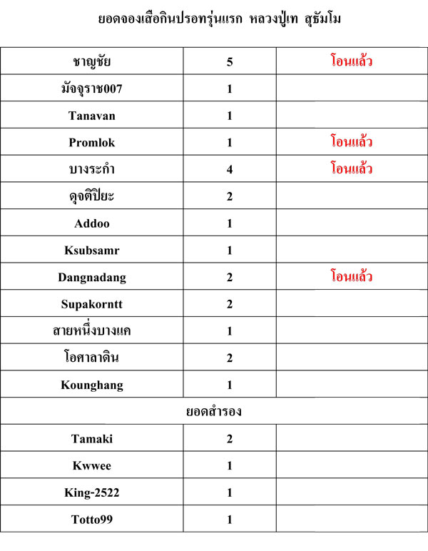 ต้องขอแจ้งให้ทราบว่า ผู้ที่มีรายชื่อจองโปรดโอนเงินภายในวันจันทร์ที่ 25 มีนาคม 2556 ด้วยนะครับ เลยจากวันนั้นท่านจะถือว่าสละสิทธิ์นะครับ