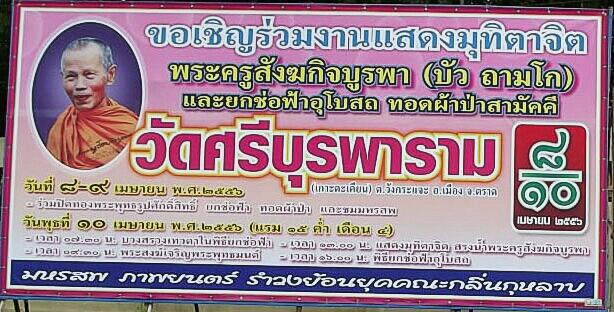 ผมขออนุญาติ"ประชาสัมพันธ์"วันที่ 10 เมษายน 2556"ขอเชิญร่วมงานแสดงมุทิตาจิต พระครูสังฆกิจบูรพา{บัว ถามโก}วัดศรีบุรพาราม จ.ตราด"และยกช่อฟ้าอุโบสถ ทอดผ่าป่าสามัคคี "