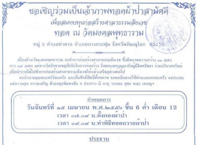 และในโอกาสนี้ทางท่านเจ้าอาวาสได้นำพระนางพญาที่ขุดพบได้ที่วัดมงคลพุทธารามนี้ ออกให้ทำบุญบูชาองค์ละ 599.-