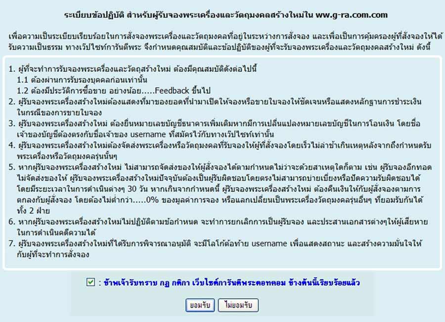 เพื่อนๆสมาชิกจำได้ใช่ไหมครับ ทุกวันที่ 31 ธันวาคม ของทุกปี เวลา 00.00 น. ก่อนจะเปลี่ยนศักราชใหม่ทางเว๊ปจะมีกฏระเบียบให้เรารับทราบละกดตกลงยอมรับจึงจะเข้าเว๊ปได้ เช่นเดียวกันครับการเปิดจองพระใหม่ตวรทำแบบนี้กับผู้ที่รับจองด้วยเพื่อให้ยอมรับข้อตกลงต่างๆ