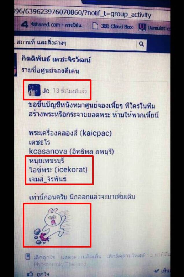 - ชื่อหนุ่ยเพชรบุรีมาโพสต์กระทู้ ผมยังไม่เปิดอ่านเลยครับ จนกระทั่่งมีลูกค้าโทรมาบอก ผมจึงเข้ามาอ่าน ตอนแรกก็ไม่สนใจจะยุ่งเกี่ยว ไม่ตอบอะไรทั้งสิ้น แต่ผมรับไม่ได้ในสิ่งที่มีการแก้ไข ดัดแปลง เพิ่มเติม เพื่อโจมตีผมแบบนี้ครับ กลับมาพูดถึงหนุ่ยเพชรบุรี ผมไม่รู้จัก ไม่เคยคุย ไม่เคยจองพระด้วย ไม่เคยมีปฏิสัมพันธ์ใดๆ ต่อกัน เต็มที่คือไปทำตาโตในกระทู้ที่นำภาพพระสวยๆ มาลง