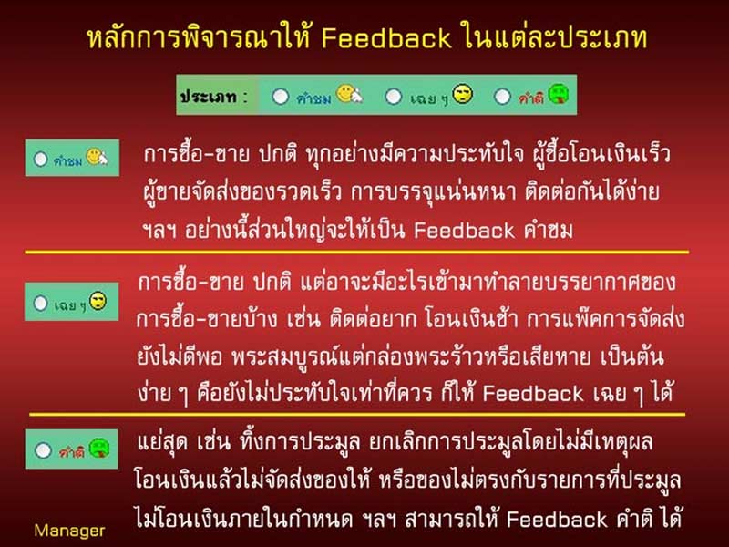 จากคำติที่เพื่อนสมาชิกให้มา เรื่องการบรรจุหีบห่อ ซึ่งไม่ได้ทำให้พระที่ส่งเกิดความเสียหาย เพราะถ้าเสียหายผมก็ยินดีรับผิดชอบทุกอย่างตามกฏอยู่แล้ว ซึ่งการได้ฟีตแบ็คคำติเรื่องการบรรจุหีบห่อน่าจะไม่ถูกต้อง และผมได้รับความเสียหายต่อความน่าเชื่อถือ ซึ่งผมยินดีจะนำการบรรจุหีบห่อมาปรับปรุงในการส่งคราวหน้าให้ดียิ่งขึ้นกว่าเดิม
