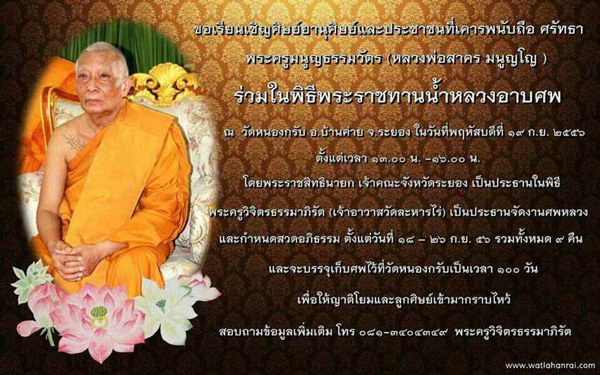 วันนี้ 19 กันยายน 2556 ทางวัดหนองกรับ ได้จัดให้มีพิธีสรงน้ำศพ หลวงพ่อสาคร ที่ได้มรณภาพลงเมื่อวันที่ 18 กันยายน 2556