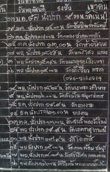 วันนี้มีโอกาสเดินทางที่วัดละหารใหญ่ ไปกราบหลวงพ่อสิน บูชาวัตถุมงคลในตู้มานิดหน่อย เข้าไปกราบหลวงพ่อ โชคดีมากครับหลวงพ่อพรมน้ำมนต์ให้ ได้นั่งคุยกับหลวงพ่อ ประมาณ 30 นาที ก็ขอตัวกลับ พอดีเหลือบไปเห็นป้ายกิจนิมนต์ เลยถ่ายรูปมาให้ดูกันครับ..เพราะคนบ้านไกล อาจไม่รู้ว่าหลวงพ่ออยู่วัดวันไหนบ้าง จะได้ไปพบและกราบหลวงพ่อตามที่ตั้งใจ.. |