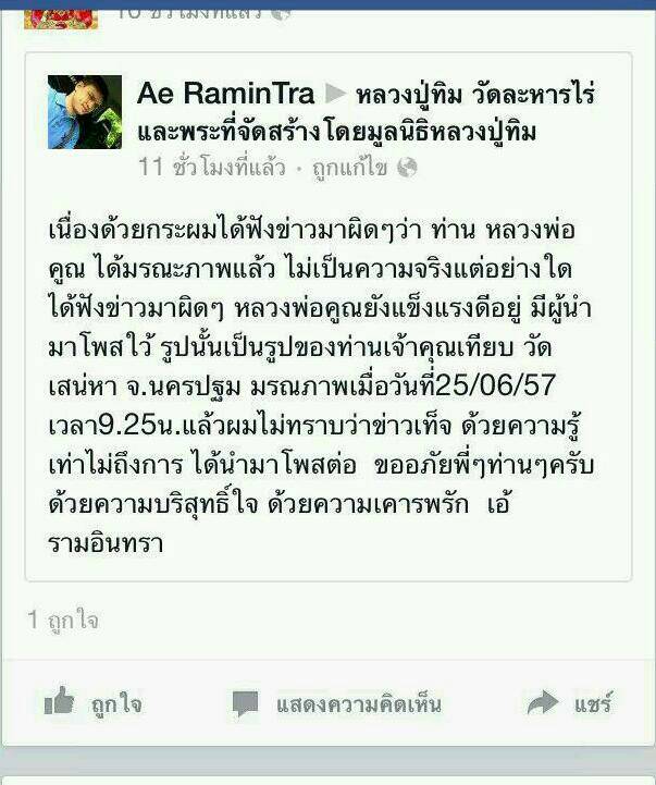 วันนี้นี้มี พรรคพวกกัน โทรมาถามไถ่ แต่เช้า เรื่อง ข่าวลือ ว่าหลวงพ่อ คูณ ท่าน มรณะภาพ เมื่อทุ่ม กว่าๆ พอเช็คข่าวก็รู้ว่าไม่จริง แต่กระนั้น ก็มีคน แชร์ ข้อมูล ออกไป แบบ ทั้งๆ ที่ตัวเอง ก็ไม่รู้ เลย ว่ามันจริง หรือเปล่า เรียกว่า แชร์ เอามันส์ เอาโล่