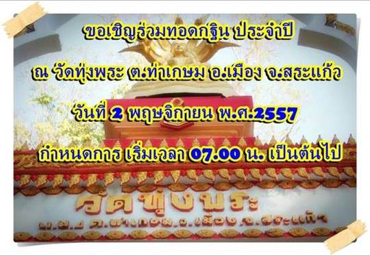 ขอเรียนเชิญพี่ๆทุกท่านที่ว่างๆอยู่ใกล้ๆวัดทุ่งพระไปทอดกฐินกันครับ วันที่ 2 พย.57 สักครั้งนึงเพื่อกราปไหว้หลวงพ่อสนธิ์ ด้วยกัน วันที่ 2 ร่วมสมทบต้นเงินถวายด้วยกันครับ ชมวิถีงานกฐินแบบชาวบ้านๆด้วยกัน พี่ๆคนไหนไปร่วมเจอกันพรุ่งนี้ และเช้าวันที่ 2 ครับผม |