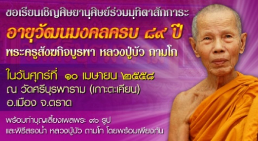 เนื่องจาก วันที่ ๑๐ เมษายน ๒๕๕๘ นี้ เป็นวันครบรอบวันเกิดท่านหลวงปู่บัว ถามโก วัดศรีบุรพาราม จ.ตราด ซึ่งท่านอายุจะครบ ๘๙ ปี ทางวัดศรีบุรพาราม(วัดเกาะตะเคียน) ได้มีการจัดงานเป็นประเพณีของทุกปี เพื่อให้บรรดาศิษยานุศิษย์ได้น้อมแสดงความมุทิตาสักการะ ต่อท่านหลวงปู่บัว ถามโก ด้วยการร่วมทำบุญเลี้ยงพระภิกษุจำนวน ๙๐ รูป และร่วมสรงน้ำ. พร้อมน้อมรับพรสิริมงคลจากท่านหลวงปู่บัว ถามโก โดยพร้อมเพียงกัน