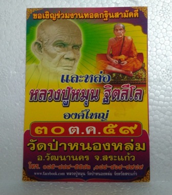 ขอเชิญชวนลูกศิษย์หลานศิษย์และผู้ศรัทธาในองค์หลวงปู่หมุน วัดบ้านจาน ทุกท่าน ร่วมงานทอดกฐินสามัคคี ที่วัดป่าหนองหล่ม วันอาทิตย์ที่ 30 ตุลาคม พ.ศ.2559 วัตถุประสงค์เพื่อสร้างรูปหล่อหลวงปู่หมุนองค์ใหญ่ที่สุดในโลก ในวันนั้นจะมีพิธีหล่อรูปหลวงปู่หมุนองค์ใหญ่ด้วยครับ ขอเรียนเชิญทุกๆท่านช่วยบอกต่อๆกันไปด้วยนะครับ พวกเราลูกศิษย์หลานศิษย์หลวงปู่หมุน จะได้มีรูปหล่อองค์ใหญ่ไว้กราบไหว้ บูชาขอพรกัน ลูกศิษย์หลานศิษย์หลวงปู่หมุน รวมพลังสามัคคีเจอกันที่วัดป่าหนองหล่มในวันทอดกฐินครับ |