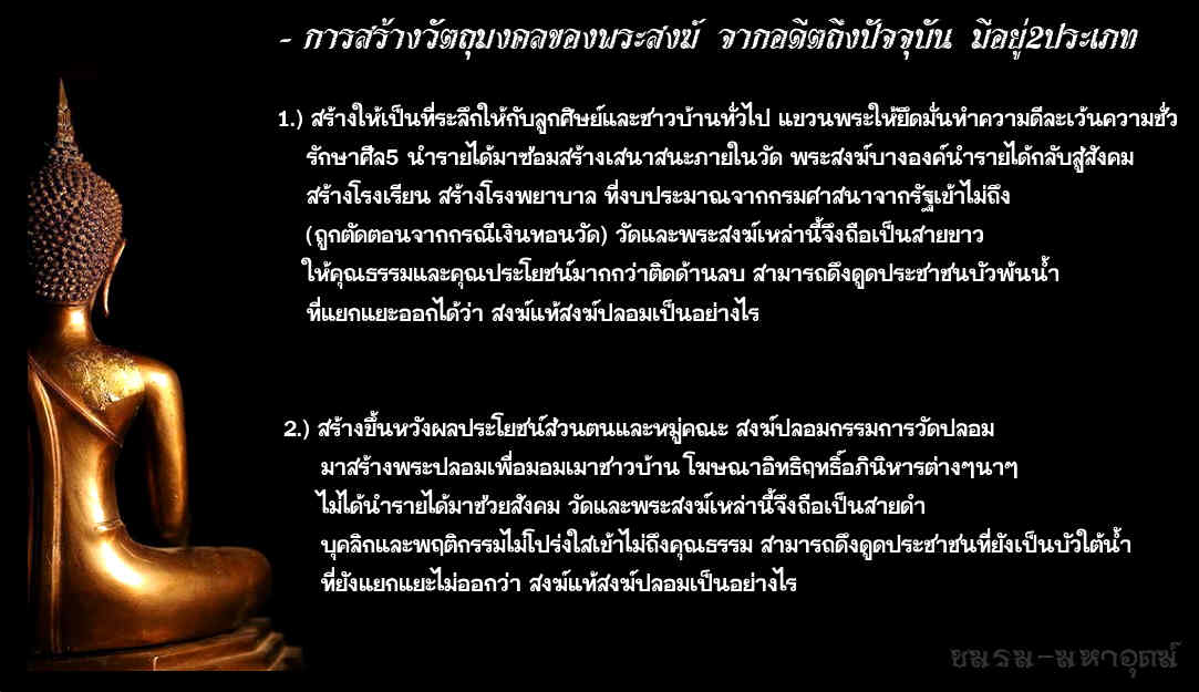 2.) สร้างขึ้นหวังผลประโยชน์ส่วนตนและหมู่คณะ สงฆ์ปลอมกรรมการวัดปลอม มาสร้างพระปลอมมามอมเมา โฆษณาอิทธิฤทธิ์อภินิหารต่างๆนาๆ ไม่ได้นำรายได้มาช่วยสังคม