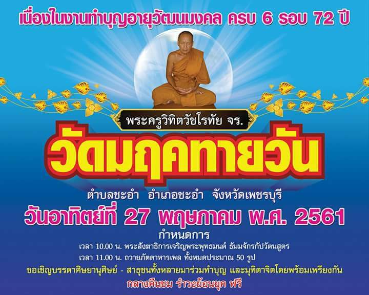 เชิญร่วมงานทำบุญอายุวัฒนมงคลครบ 6รอบ 72ปี "พระครูวิทิตวัชโรทัย" หลวงพ่อแก้ว(มณี) วัดมฤคทายวัน อ.ชะอำ จ.เพชรบุรี วันอาทิตย์ที่ 27 พฤษภาคม 2561 ผู้ที่ไปร่วมงานทำบุญมีวัตถุมงคลแจกฟรีทุกท่าน