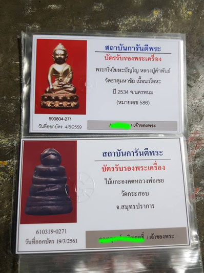 ทางพี่ชายผมได้ไปบูชาพระเครื่องมา และมีบัตรรับประกันพระแท้ติดมาด้วย (ในรูปใบล่าง) ซึ้งเมื่อพระมาถึงมือ ก็ได้เอามาเทียบกับบัตรรับประกันพระแท้ของจีพระ ที่ส่งออกบัตรเอง (ในรูปใบบน) จึงอยากให้พี่ๆสมาชิกและเว็บมาสเตอร์ช่วยพิจารณาด้วยครับ ว่าบัตรใบล่างในรูปนี้เก๊ใช่ไหมครับ |
