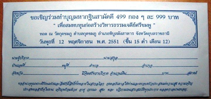ท่านที่ร่วมทำบุญจององค์กฐินจะได้รับวัตถุมงคล (วัตถุมงคลชุดนี้ไม่มีให้บูชา) และใบอนุโมทนาจากหลวงปู่คำบุ คฺตตจิตโต