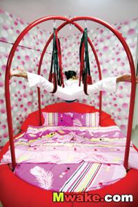 ไม่เสียชื่อแดน "เจ้ากายกรรม" จริงๆ เล้ยยยย! ก็ดูสิคะ..ขนาดห้องพักโรงแรมม่านรูดจีนห้องนี้ยังออกแบบเอาไว้สุดพิสดาร.. มีสายคล้องระโยงระยางให้....... กันด้วยท่าทางลอยฟ้า ยากเย็นยิ่งกว่าเล่นยิมนาสติก! (ฮา)