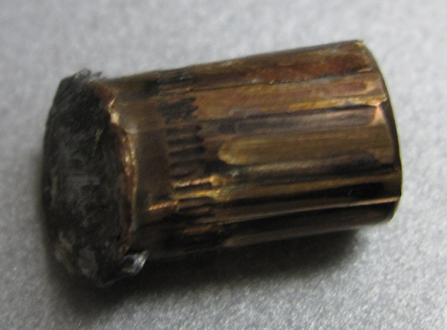เมื่อเช้า 5/12/51 เวลาประมาณ 4.00 น. ผมกำลังหลับเพลินๆ อยู่ก็สะดุ้งได้ยินเสียงดังที่หลังคา ดังจนตื่นทั้งบ้าน นึกอยู่ว่าไม่ใครปาหลังคาบ้านก็ซีเมนต์ที่ยาแนวสันหลังคาตกลงมาแน่(เคยตก) เลยไม่ใส่ใจจนเช้าดูที่พื้นห้องมีเศษฝาแตกตกอยู่ดูไปมาเจอหัวลูกปืนบนผ้าห่ม ห่างจากที่นอนไม่ถึงคืบ ถ้าเข้ามาอีกสัก 50 ซม. โดนลูกสาวผมที่นอนอยู่กลางแน่นอน เลยนึกทันทีว่าคุณพระช่วยคุ้มครอง จากนั้นนึกต่อมาว่า แล้วใครมันจะมาจ่ายเงินค่าซ่อมหลังคากับฝ้าให้ตูว๊ะ เฮ้อฟาดเคราะห์ครับ เพราะถ้าโดนคนเจ็บแน่ (หลังคาที่บ้านหนาประมาณ 1 นิ้ว วางมุมเฉียงประมาณ 45 องศา เลยหนา 1.42 นิ้ว ฝ้าอีก 1 ซม. ทะลุลงมาเลยครับ) |