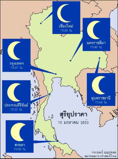 *** บ่ายวันนี้ วันศุกร์ที่ 15 มกราคม 2553 จะเกิดสุริยุปราคาซึ่งปีนี้ประเทศไทยมีโอกาสสังเกตได้เพียงครั้งเดียว สุริยุปราคาวงแหวนครั้งนี้มีเส้นทางคราสวงแหวนผ่านทวีปแอฟริกา มหาสมุทรอินเดีย ทางใต้ของประเทศอินเดีย ศรีลังกา พม่า และจีน ประเทศไทยไม่ได้อยู่ในเส้นทางคราสวงแหวน แต่อยู่ในเขตที่สามารถสังเกตสุริยุปราคาบางส่วนได้โดยภาคเหนือเห็นดวงอาทิตย์แหว่งมากที่สุด