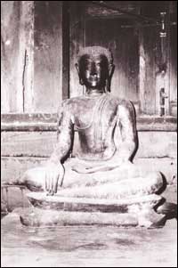 ๒.พระพุทธรูปปางมารวิชัย เนื้อสัมฤทธิ์ ตักกว้าง ๖๐ ซม. ฐานกว้าง ๖๓ ซม. สูงรวมฐาน ๘๖.๕ ซม. อายุราวพุทธศตวรรษที่ ๒๒-๒๓ ศิลปะอยุธยา ลักษณะประทับขัดสมาธิราบบนฐานหน้ากระดาน ฐานชำรุดหายไปบางส่วน พระหัตถ์ซ้ายวางหงายบนพระเพลา พระหัตถ์ขวาวางคว่ำบนพระชานุ พระพักตร์รูปไข่ พระเกศาขมวดเป็นก้นหอย มีไรพระศก ติ่ง พระกรรณซ้ายหักหายไป พระขนงก่งโค้งเป็นรูปปีกกา พระเนตรหลุบต่ำ พระหนุเป็นปม ห่มจีวรเฉียง ชายสังฆาฏิเป็นเขี้ยวตะขาบ
