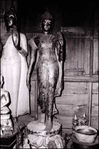 ๑.พระพุทธรูปปางลีลา เนื้อสัมฤทธิ์ สูง ๑๔๑ ซม.อายุราวพุทธศตวรรษที่ ๑๙ ศิลปะสุโขทัย ลักษณะยืนบนฐานบัว มีพระอิริยาบถในลักษณะก้าวเดิน ยกส้นพระบาทขวา พระพักตร์รูปไข่ พระเกศาขมวดเป็นก้นหอย พระรัศมีเป็นรูปเปลวเพลิง พระขนงก่งโค้งเป็นรูปปีกกา พระเนตรหลุบต่ำ พระโอษฐ์อมยิ้ม พระหนุเป็นปม พระศอเป็นปล้อง ๓ ชั้น พระหัตถ์ยกขึ้นเสมอพระอุระป้องไปเบื้องหน้า พระกรขวาอยู่ในท่าไกว พระพาหากว้าง ห่มจีวรเฉียง ชายสังฆาฏิเป็นเขี้ยวตะขาบ