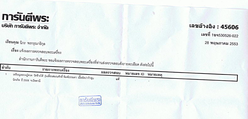 พอดีส่งเหรียญเลื่อน ออกบัตร ได้ผลพระแท้แต่ไม่ออกบัตรให้ ก้ไม่เป็นไรครับ