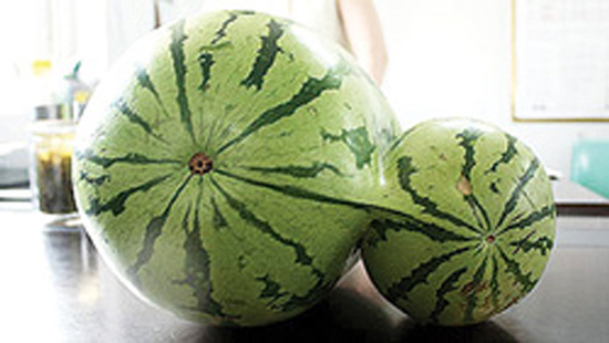 ข่าวไม่ได้บอกว่าแตงโมแฝดลูกนี้ เนื้อข้างในสีอะไร รสชาติจืดหรือหวานครับ ... ขอความกรุณา จินตนาการเอาเองตามใจชอบใจรัก นะครับ  |