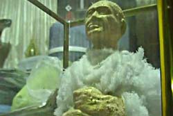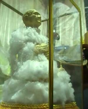 นายสหราช บอกว่า ได้บูชาต่อรูปหล่อเหมือนนี้มาจากเพื่อน และเมื่อนำมากราบไหว้บูชาได้ระยะหนึ่งก็พบว่า มีสิ่งผิดปกติเกิดขึ้นจึงได้ศึกษาค้นคว้าข้อมูลจนพบว่า ปรากฏการณ์ดังกล่าวเป็นลักษณะหนึ่งของพระธาตุเสด็จตามความเชื่อแต่สิ่งที่ เกิดขึ้นนี้เป็นลักษณะของพระธาตุอ่อนที่พบได้ตามเครื่องรางของคลังที่พระ เกจิรุ่นเก่าๆได้สร้างเอาไว้ และเป็นสิ่งของหายากเนื่องจากผู้ที่มีความเชื่อต้องการนำไปกราบไหว้บูชา เพื่อความเป็นสิริมงคล แต่ตนเองมีความเลื่อมใสศรัทธราต่อเจ้าอาวาสวัดสระสี่เหลี่ยมจึงได้นำมาถวาย ให้ดังกล่าว |