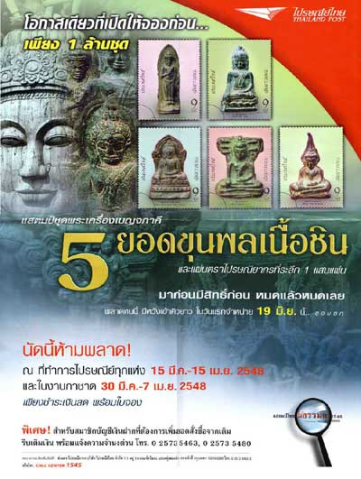 นางสาวอานุสรา จิตต์มิตรภาพ ผู้ช่วยกรรมการผู้จัดการใหญ่ด้านการตลาดและพัฒนาธุรกิจ ปณท เปิดเผยว่าจากกระแสการตอบรับแสตมป์ชุดพระเครื่องเบญจภาคีที่ได้รับความสนใจเป็นอย่างมากจากนักสะสมแสตมป์ ผู้นิยมพระเครื่องและประชาชนทั่วไปในปีที่แล้ว จึงกำหนดให้มีการสั่งจองล่วงหน้าสำหรับแสตมป์ชุดพระเครื่อง 5 ยอดขุนพล หรือเบญจภาคีเนื้อชินซึ่งคาดว่าจะได้รับความนิยมสูงเช่นเดียวกัน ระหว่างวันที่ 15 มีนาคม 2548- 15 เมษายน 2548 นี้ ณ ที่ทำการไปรษณีย์ทุกแห่งทั่วประเทศ และยังสามารถจองได้ที่บูธของบริษัท ไปรษณีย์ไทย จำกัด ภายในงานกาชาดประจำปี 2548 ระหว่างวันที่ 30 มีนาคม 7 เมษายน 2548