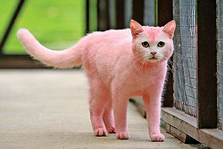 เจ้าแมวน่าสงสารตัวนี้ เดิมทีเกิดมาขาวจั๊วะแต่วายร้ายที่ไหนไม่รู้ เอาสีมาย้อมซะจนขนเป็นสีชมพู้-ชมพูทั้งตัว กลายพันธุ์เป็น 'พิ้งแพนเธอร์' เรืองแสงได้ในที่มืดเลยง่ะ