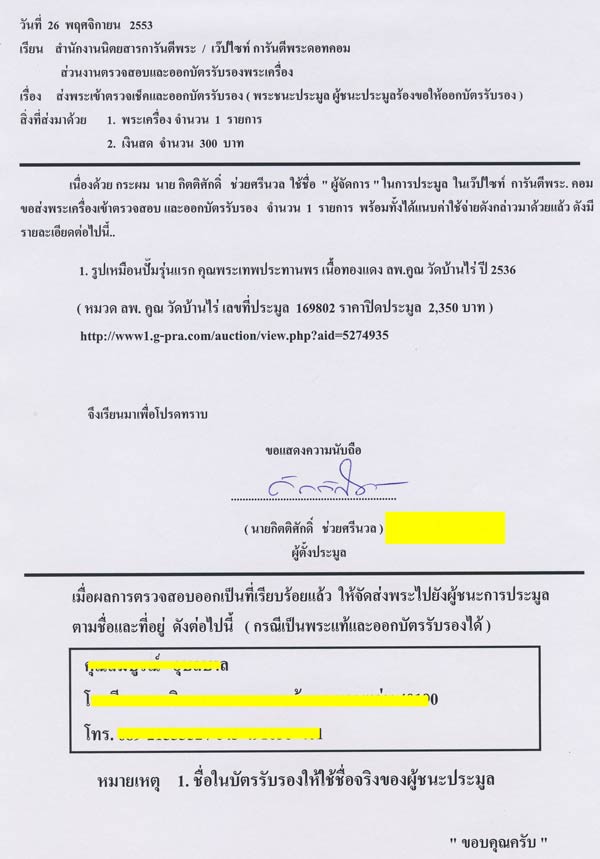 | หัวข้อกระทู้ : => เผื่อมีประโยชน์ครับ.....แบบฟอร์มส่งพระชนะประมูลเข้าตรวจสอบและออกบัตรรับรอง...... |