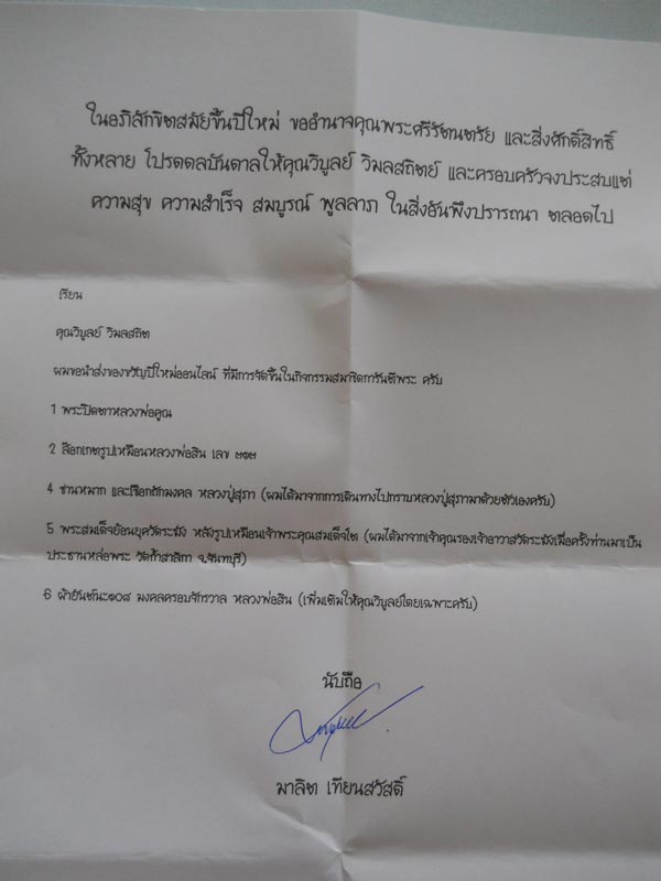 ท่านได้ให้ของขวัญเป็นพระและวัตถุมงคลมา 6 รายการ รวม 7 สิ่ง ซึ่งขอบรรยายด้วยภาพนะครับ ... นอกเหนือจากวัตถุมงคลแล้ว คุณมาลิต ได้กรุณาแนบหนังสืออวยพรปีใหม่ ให้แก่ผมและครอบครัวด้วย ผมขอขอบพระคุณมา ณ ที่นี้อย่างยิ่ง และก็ขอให้ พรอันประเสริฐทั้งหลายทั้งปวง จงหวนคืนกลับสู่ คุณมาลิต และครอบครัว เป็นร้อยเท่าพันทวี ครับ