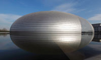 เจ้าหน้าที่ทำความสะอาดโรงละครแห่งชาติของจีน โรงละครแห่งใหม่ในกรุงปักกิงที่มีรูปทรงเหมือนไข่ มีชื่อเล่นว่า โรงละครไข่ โรงละครแห่งนี้มีหอประชุมหลัก 3 หลัง หอแรกรองรับผู้ชมคอนเสิร์ตโอเปร่าได้ 2,416 คน หอสองมีไปป์ออร์แกน ผู้ชมนั่งได้ 2,017 คน และหอสามสำหรับละครเวที จุผู้ชม 1,040 คน
